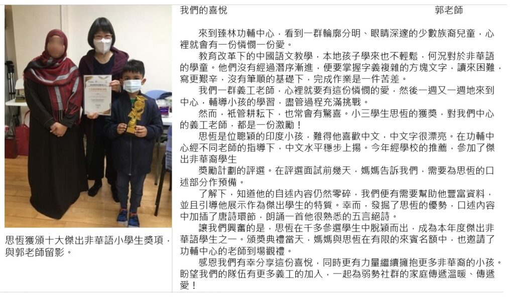 功課輔導 少數族裔學童功輔、語文補習班 幫助非華語學生處理日常功課,尤其是中文和數學。 以正向行為支持的理念鼓勵學生學習中文,改善學習情意,塑造學生正面、積極的品格。 與家長合作,為學生訂定最合適的教學方向。 申請/查詢功課輔導 真誠分享 終於放暑假了,多謝導師開了幾次穿珠班,讓我們輕鬆一下,發掘不同的興趣,學習聽從指導和創意。🤩 「我這條是送給媽媽的,她喜歡綠色和黑色。」一位小五的南亞裔男孩子亞恩不怕被同輩取笑,注專地穿手鍊。 孩子重溫「情緒管理」感恩他們個別講出 – 為什麼有這些情緒+如何處理😉
